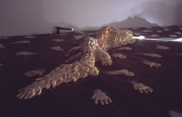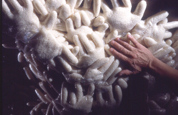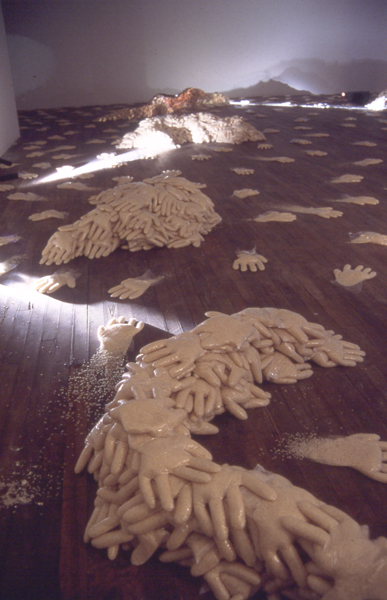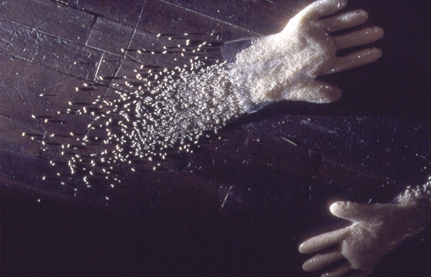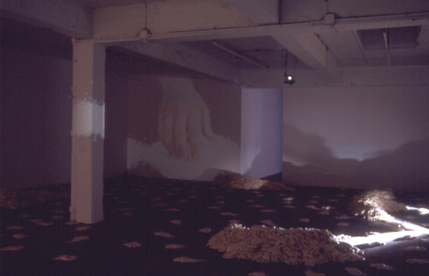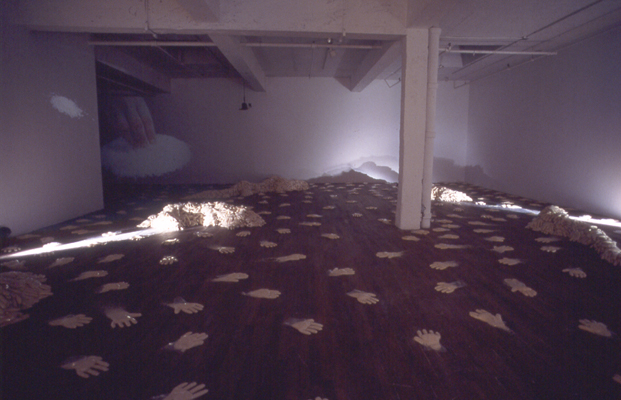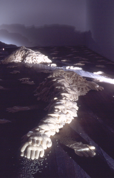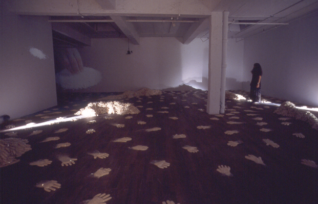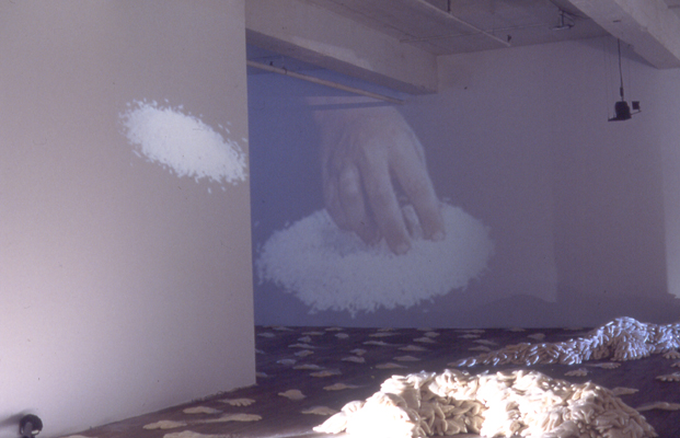 In To Leave and to Take, Irit Batsry uses a simple basic unit: a “hand” made of rice. The rice hands (about 2000 of them, adding up to one ton of rice) are dispersed in the space as traces of an itinerary and as “building blocks” for shelter units. The shelter units, reminiscent of sand bag barricades, can be perceived as half built or half destroyed. Video tapes, evoking a Sisyphean endeavor, are projected in this darkened, transformed space.