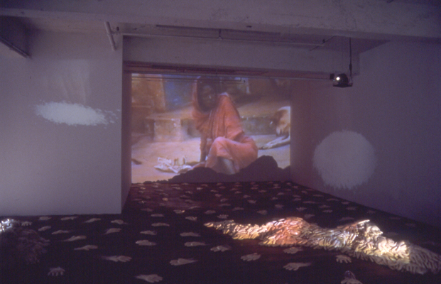 To Leave and to Take thus evokes notions of food and shelter through the use of poetic objects and video projections. The installation is part of a thematic project in progress entitled, Neither There Nor Here. The project, initiated in 1995 after a short stay in the South of India, is being produced during an artist's residency at the Academy of Media Arts, Cologne.