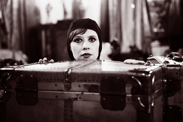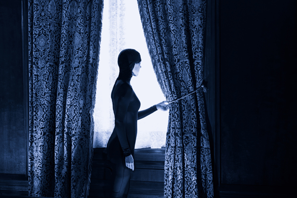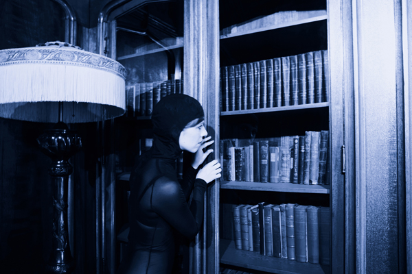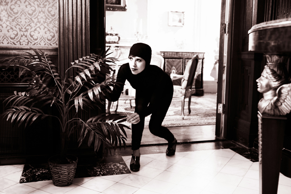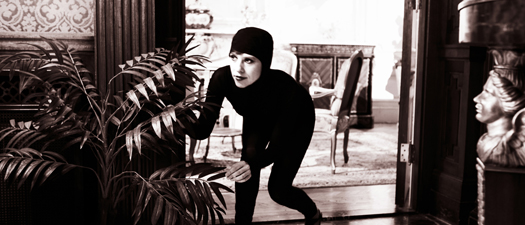 Acting as director and performer, the images are a re-enactment of photo stills from Louis Feuillade's 1915 "Les Vampires" film.