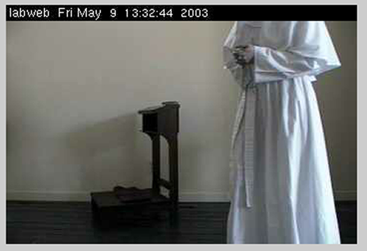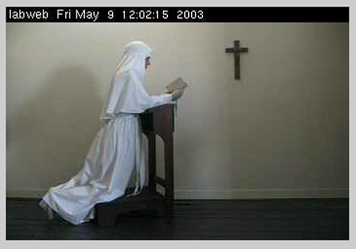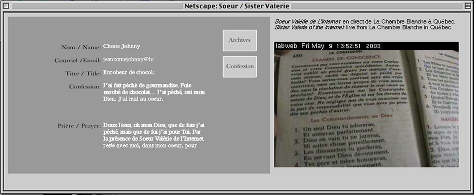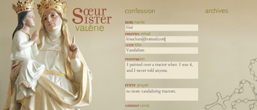 The online website component of the project uses a database to collect and archive user's confessions. The performance of Sister Valerie features a live streaming video of the artist praying situated wihtin an interface that invites the public may to confess in real time.