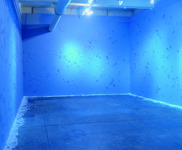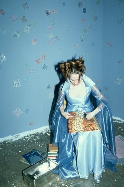 The Snow Flake Queen is a performance / installation project based on Hans Christian Andersen’s tale, “The Snow Queen,” wherein a devious Queen casts an evil spell on a village, which they may only be released from by spelling the word “eternity” out of ice. The installation is comprised of a collection of over a thousand one-of-a-kind hand-cut paper snowflakes made of colourful gift-wrapping paper, which are pinned to the wall. On one wall the word “eternity” is spelled out in a blizzard of flakes. The SFQ performance features me dressed in a costume fit for a “queen” where I offer to make snowflakes out of classic fairy tale book illustrations for the viewers as souvenirs of their “joyful” visit.